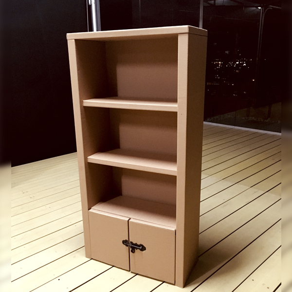 Estantería multifuncional en cartón con puertas y pasador.