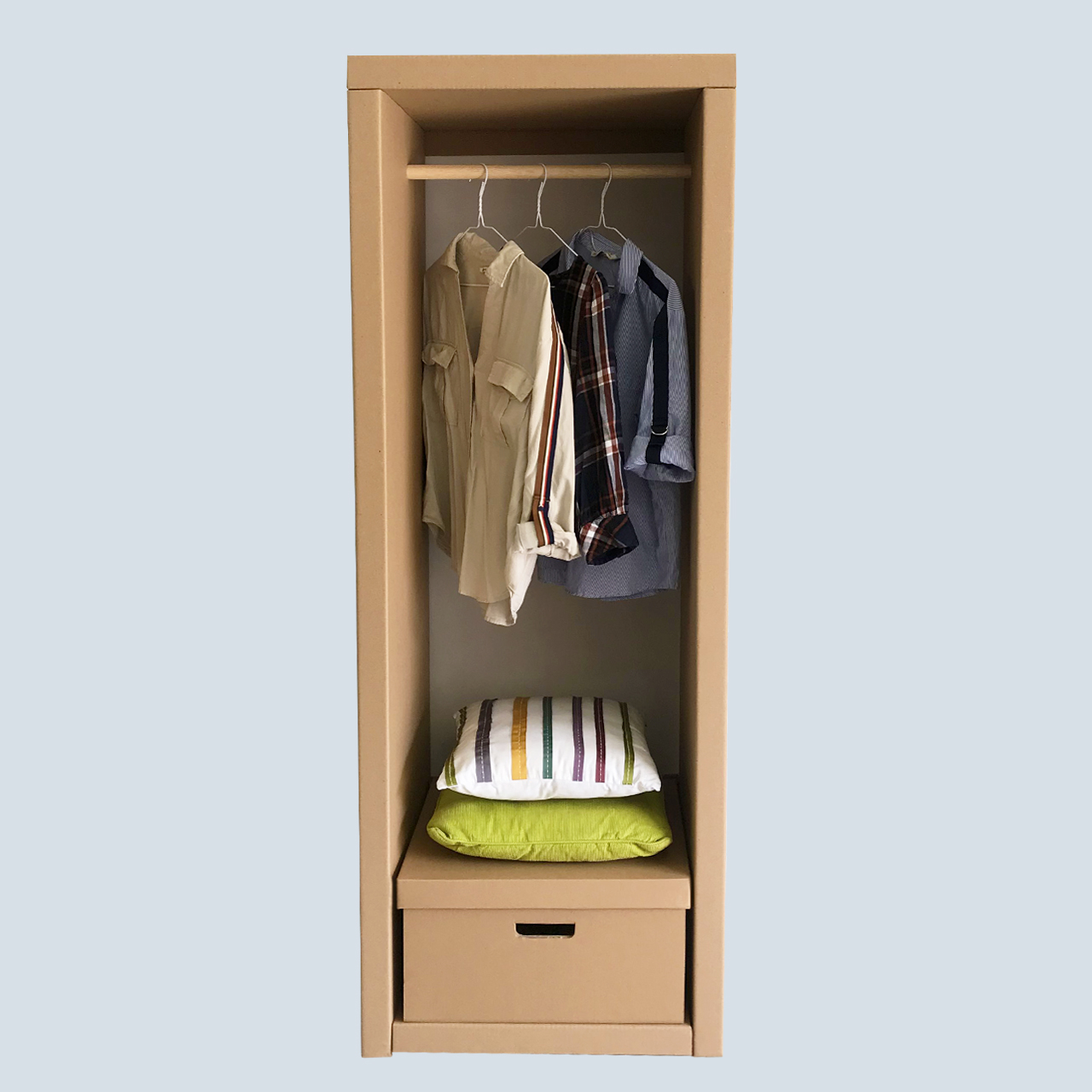 Guardarropa en cartón estructural kraft con cajón inferior y bolillo en madera para colgar. Ideal para ferias donde necesites exhibición de prendas para colgar , o para tu casa. Cuenta con espacio de almacenamiento en la base. Muy resistente, liviano y práctico.